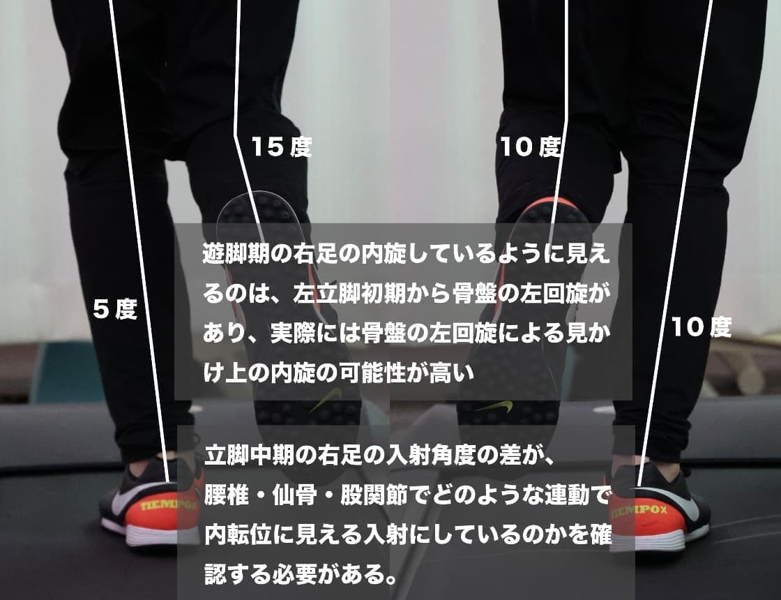 そのため、中殿筋の出力低下や足の接地に問題があり、運動軸が大転子でなくなった場合、骨盤ごと回旋させる・骨盤が残る走り方になってしまいします。