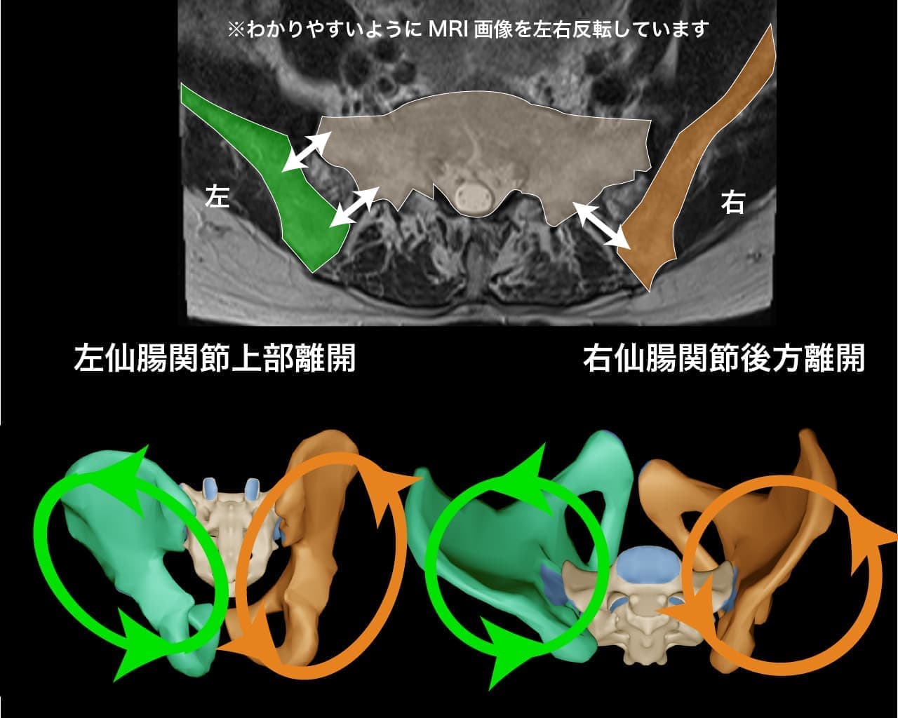 ・関節の不安定によって仙腸関節の運動軸が変化し、脊柱や股関節の運動障害も起こるケース