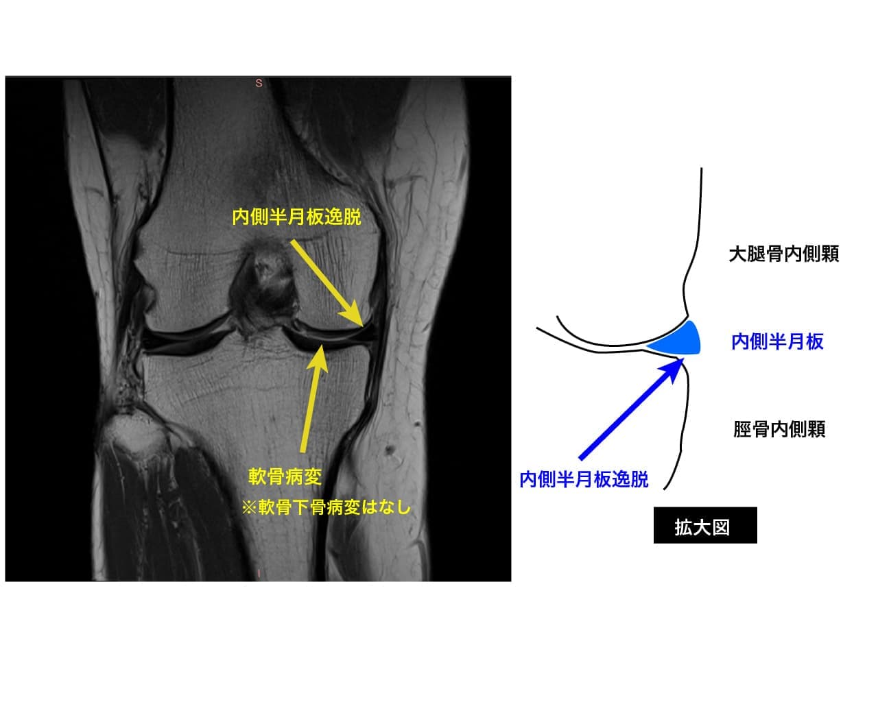 半月板の逸脱により「フープ機能(荷重分散)」が低下し、変形性膝関節症(膝OA)の発症や進行の原因になります。半月板逸脱は変形性膝関節症でよく見られ、関節裂隙の狭小化と強く関連しています。また、症状を悪化させる独立した要因であることが明らかにされています。