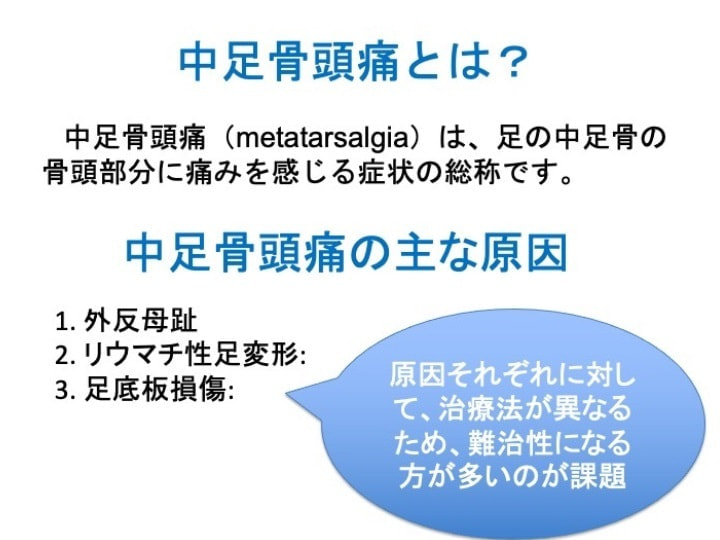 中足骨頭痛は単なる症状であり、外反母趾、リウマチ、足底板の損傷など様々な要因が絡んでいます。それぞれの原因に応じた治療が必要ですが、複数の要因が絡むことも多く、正確な原因を特定することが難しいケースがあります。また、足関節や後足部の問題が中足骨頭痛に関連している場合もあり、複雑な診断が求められます。