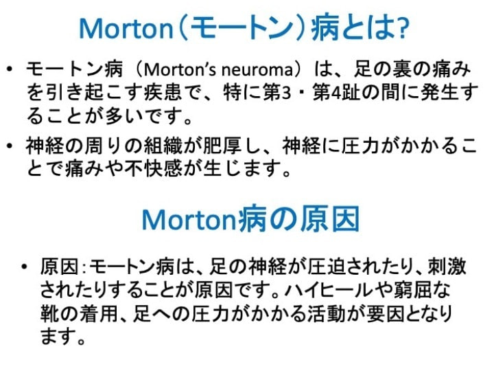 扁平足など横アーチの低下、ハイヒールや窮屈な靴による足趾の圧迫による足底への過負荷により症状が誘発されていきます。