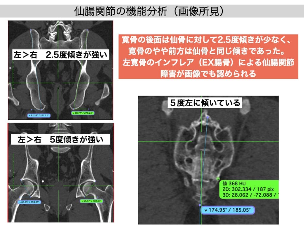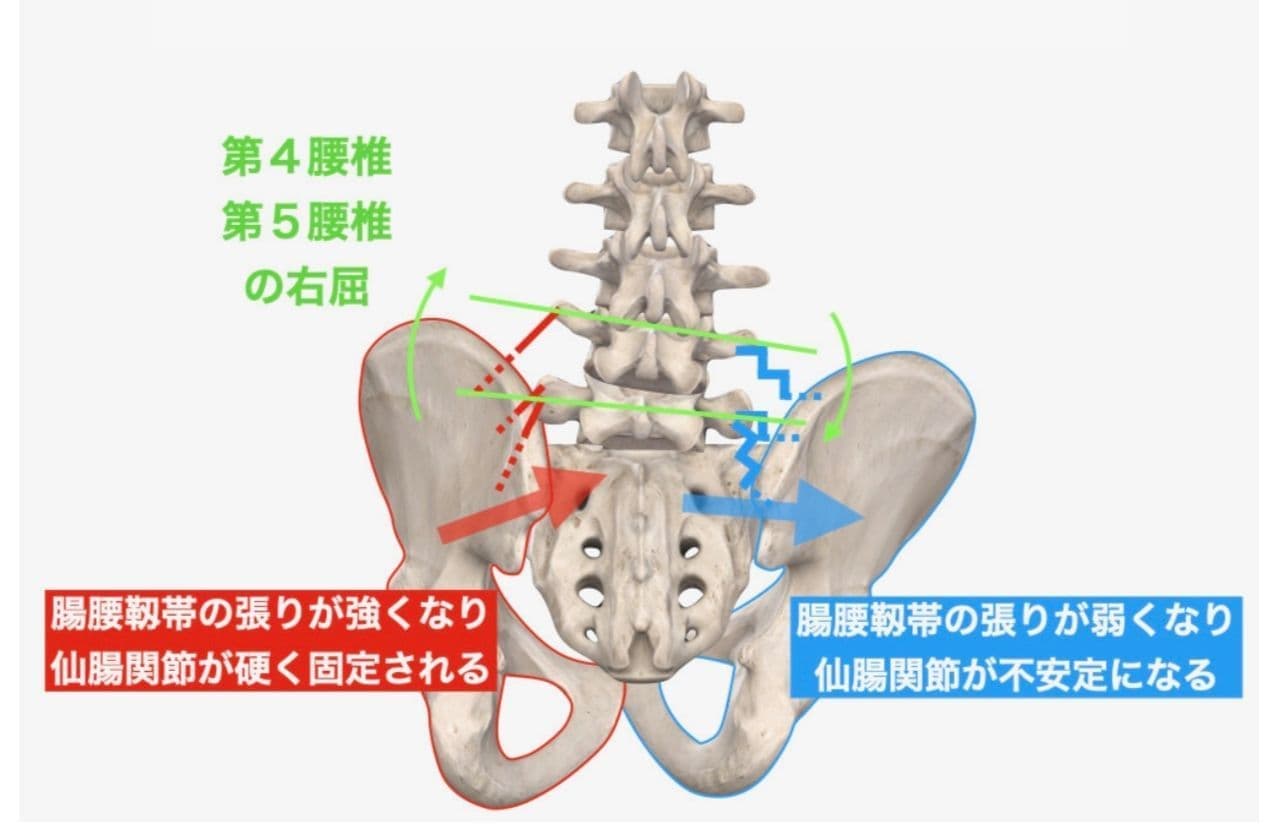 ・関節の不安定によって仙腸関節の運動軸が変化し、脊柱や股関節の運動障害も起こるケース