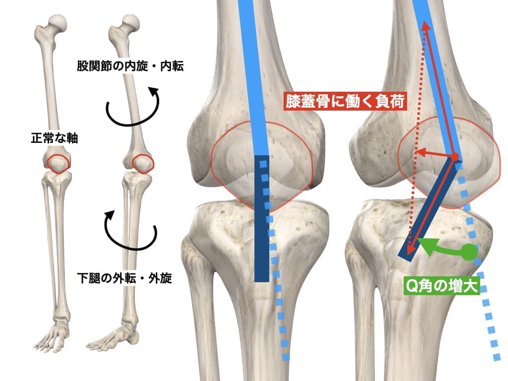 膝関節は骨盤の向き・股関節の角度によって位置が変化するため股関節・腰・骨盤の状態が重要になります。