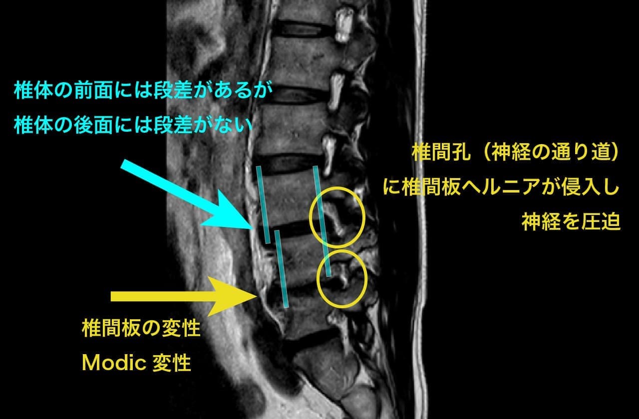 飛び出ていなくても椎間板が変性を起こすとMRI画像で他の椎間板と色が異なる変化を来たすことがあります。これが悪化すると上下の椎骨の椎体部分の終板と呼ばれる表面が変性を起こし(Modic変性)痛みを起こすことがわかってきています。